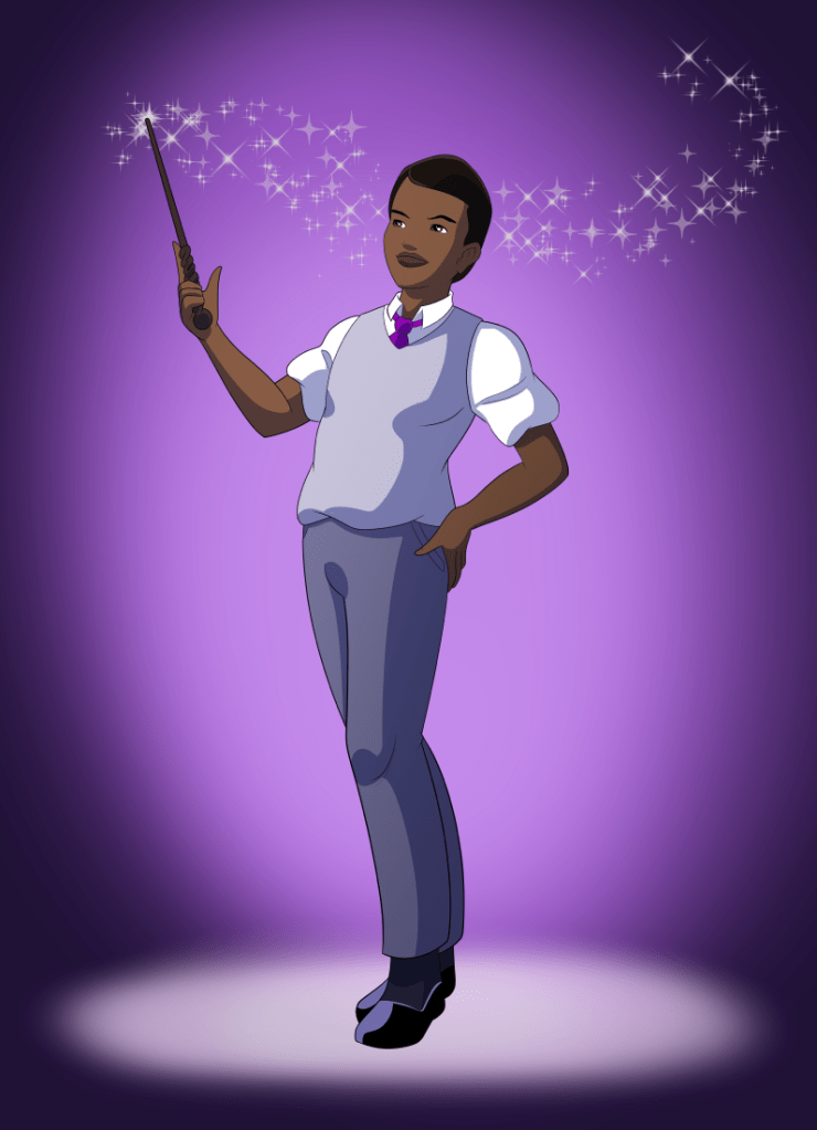 My version of the characters. I know, even the ones who do have the same gender as canon don’t look much like the movie versions. Dumbledore looks much younger and Hermione definitely doesn’t look like Emma Watson. That’s completely deliberate: I always imagined that in the witching world, witches and wizards aged a lot more slowly, post-puberty…. so though Dumbledore is well above a hundred, in my AU he still looks like he’s in his forties. As for Hermione, I imagined her as black long before I saw the movies, so in this universe she’s black.